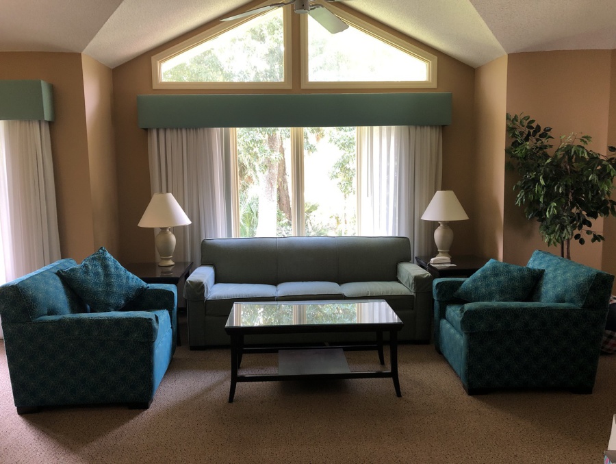 The spacious Living Room is located just off the villa entrance. Comfortable seating, cable TV (50" HD LCD!) and a VCR/DVD unit create the perfect setting for entertaining or relaxing after a long